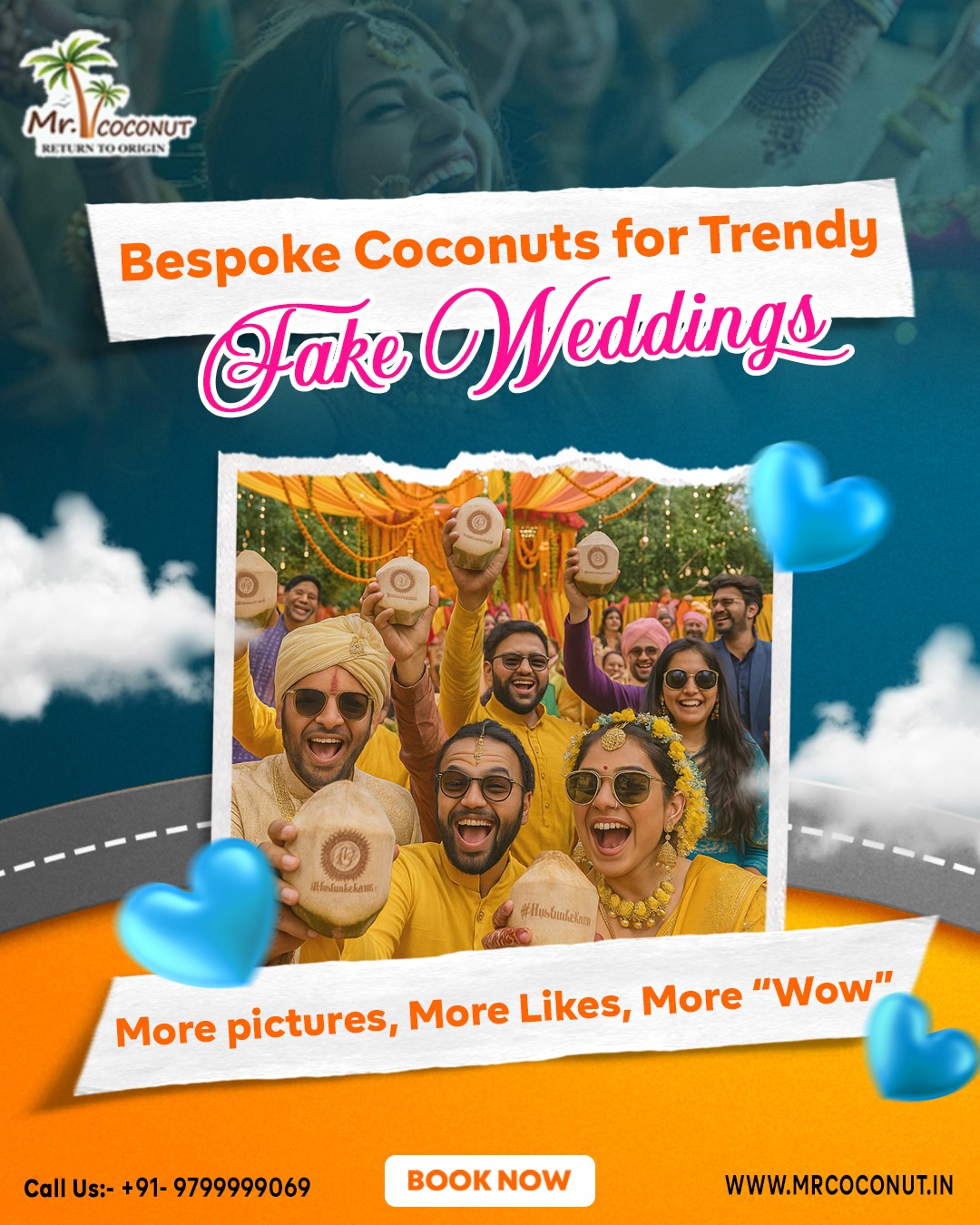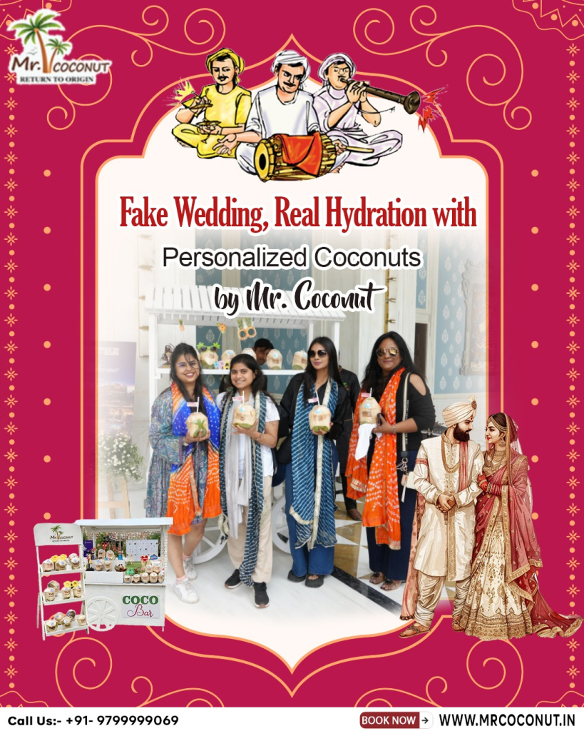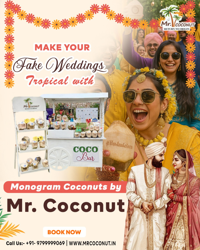 Imagine stepping into a glittering sangeet — dhols thumping, cocktails flowing — only to realise there’s no actual couple tying the knot. That’s a “fake wedding,” a new trend in Indian weddings where guests revel in full-scale nuptial pageantry minus the legal vows. The idea has exploded in India’s metros: searches for “fake wedding party” grew 430% on Google between mid-2024 and mid-2025, while event planners in Delhi and Bengaluru report bookings jumping from a handful in 2023 to more than 60 large-format events this year, according to coverage in BBC News and The Economic Times. Riding that momentum, organisers now curate every sensory detail — from AI-generated invitation reels to experiential food-and-beverage counters like customized coconuts and “Cocobars” by Mr. Coconut— ensuring the night is as photogenic as it is unforgettable. But, why are many fake wedding organizers preferring personalized coconuts by Mr. Coconut.