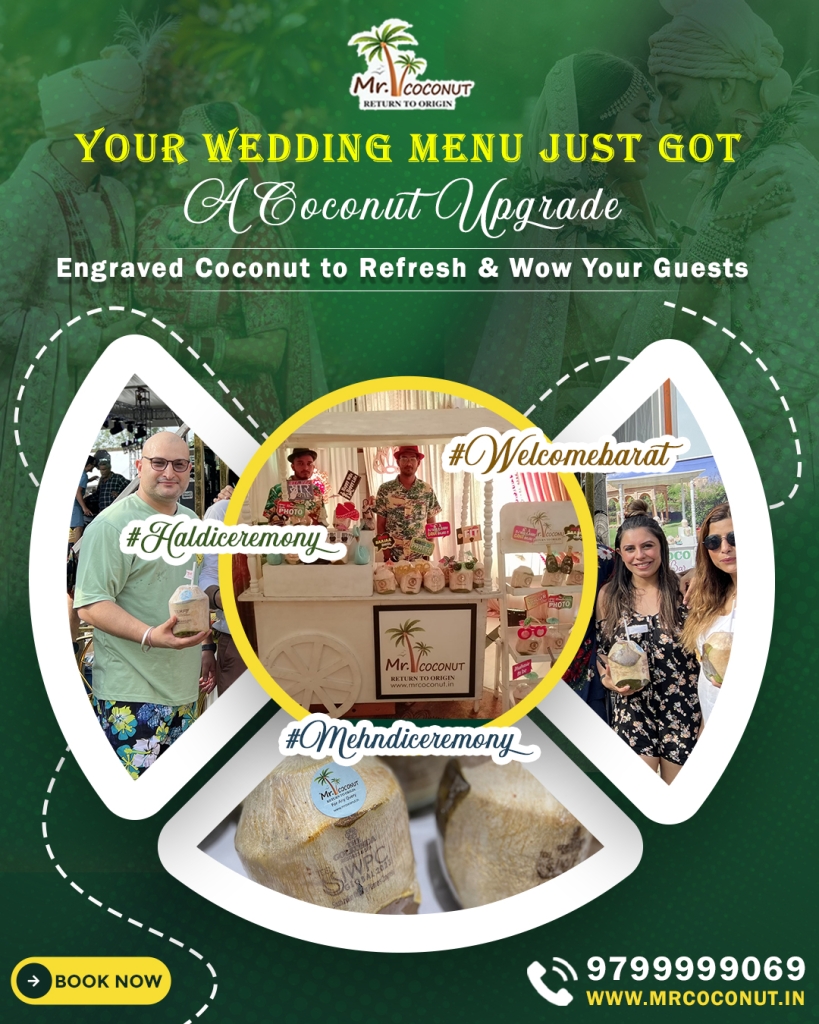 Mr. Coconut has revolutionized Wedding Drink Ideas with their artistically Embossed Coconuts featuring couple names, traditional Gujarati patterns, wedding logos, or personalized messages. These eye-catching creations serve chilled Coconut Water—nature’s perfect electrolyte-rich beverage that guests of all ages can enjoy.